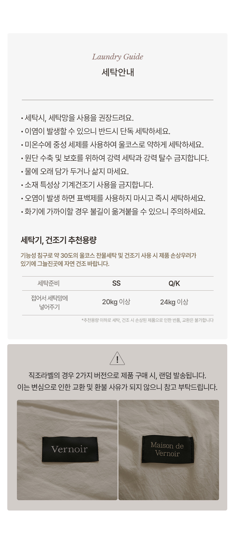 · 이염이 발생할 수 있으니 반드시 단독 세탁해주세요.